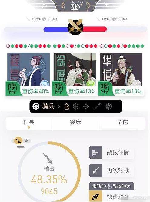 本阵容纯云,要战报自己赛季末去组一个,不过兵无常势和杯蛇鬼车的攻击补血,保证了队伍的续航和伤害,华佗虽然是工具人,但是补血能力强劲,整个阵容伤兵不多,这个阵容不怕诸葛,被算了也没有多少伤害,暂避锋芒全给程昱的话,有兵无常势+勇者得前+杯蛇鬼车+青囊书四大补血防御技能护身,基本上都能满血打完八回合。