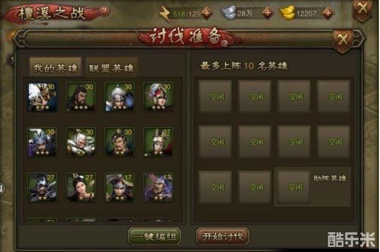 注意!此时就需要您开始思考“策略”了!一个城只能上10个将,所以上阵时既要考虑前排后排武将的搭档,又要考虑到讨伐过程中阵亡武将的替补。