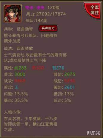 凌统是东吴少将,少年英雄;十八岁时即统领一军,横扫江夏黄祖之敌。他在游戏中的兵种为反曲劲弩,是典型的擅长暴击弓兵部队,闪避格挡额外加成。