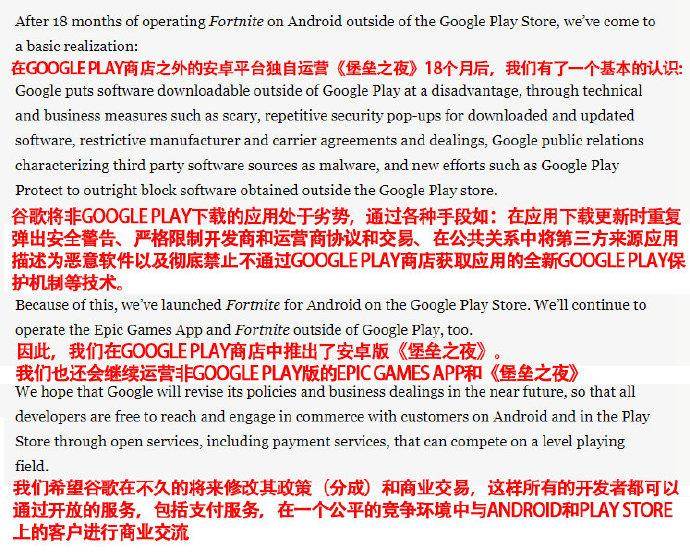 Epic 在其最新的官方声明中,指出了 Google Play 对于非由自己代理的第三方应用的打压,包括了“在应用更新时重复弹出安全警告”、“严格限制开发商、运营商的协议与交易”、“将第三方应用描述为恶意软件”等一系列行为。在此之前,Epic 因为无法接受 Google Play 高达30%的收入分成,而选择在自己的 Epic Games 应用上发行了《堡垒之夜》。