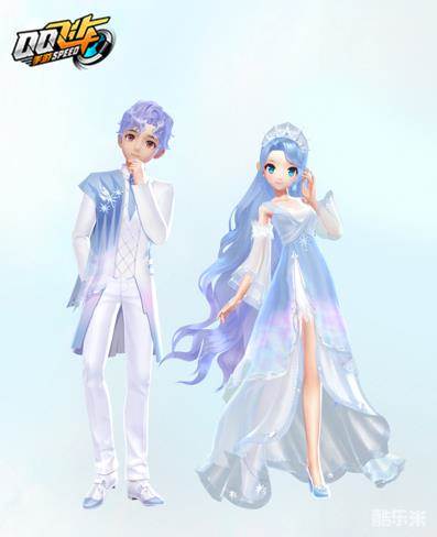 白色礼服量身打造,凸显男生挺拔的身姿。右肩增加了蓝色渐变叠片,雪花造型的胸针带来静谧之感。女生蓝色长发微卷,搭配银质王冠,高雅尊贵。轻透长裙层层叠叠,半透明的袖子随着动作摆动,魅力十足。