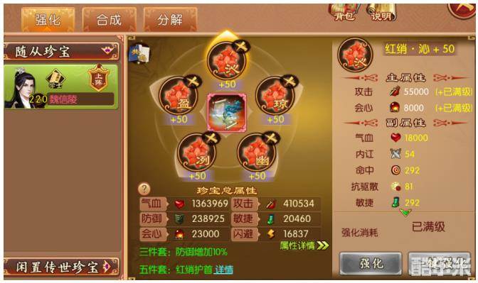 2)传世珍宝突破对应等级后将会开启花魂孔,镶嵌对应位置的花魂可获得属性提升,佩戴一整套花魂可激活套装效果(花魂位于珍宝界面);