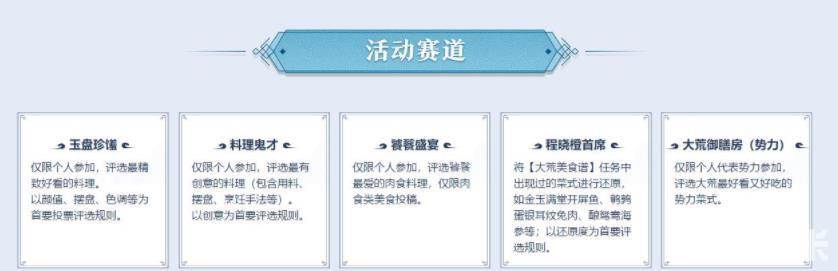 本届大赛将开设五条评选赛道,分别是【玉盘珍馐】、【料理鬼才】、【饕餮盛宴】、【程晓橙首席】以及【大荒御膳房】。前4条赛道仅限个人参加,分别评选最精致好看的料理、最有创意的料理、饕餮最爱的肉食料理;【程晓橙首席】赛道则要求玩家还原【大荒美食谱】中出现过的菜式,还原度高者胜哦!
