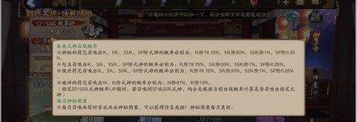 阴阳师是一款回合制RPG手游,式神是游戏里非常重要的一部分,也可以说是游戏的基础,阴阳师UP活动是一个提高抽取SSR/SP式神概率的活动,概率一般是提升至2.5倍。机会一般是3次,在抽到3个SSR/SP之后就不在提升概率了。