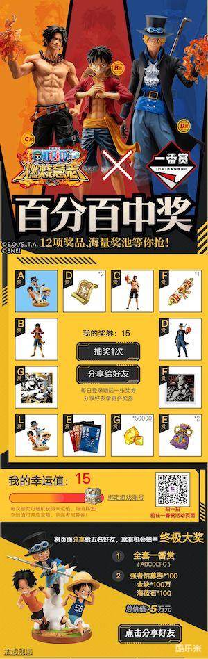 活动参与方式:微信关注航海王燃烧意志手游公众号,点击菜单栏”一番赏“--”一番赏抽奖活动“随即参与活动