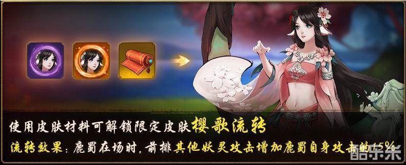 “樱歌流转”皮肤以粉色为主色调,仿佛春天到来,令繁花盛开,为山林染上了粉色。宽大的衣袂上绣有锦绣花团,轻轻挥舞时,恰如繁华飘飞,惊艳唯美。该皮肤还可为鹿蜀带来流转效果,使其在场时,为前排其他妖灵的额外攻击增加鹿蜀自身攻击的15%。
