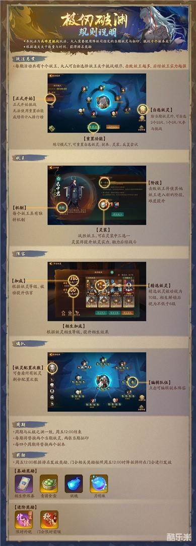 从极之渊内,仍有太多的隐秘等待着降妖师去探寻,更有数不尽的强敌等待你去战胜!今日更新后,全新玩法“极仞破渊”将正式上线,这一极高难度的玩法唯有通关当期从极之渊无恢复模式40层后的降妖师方有资格进行挑战!每期“极仞破渊”中都有十位妖王,降妖师可自行选择挑战顺序,但只能自行携带两位SSR妖灵和一位SR/R妖灵参与挑战,其余妖灵和拓印由降妖司指定,击败的妖王越多,后续妖王的实力越强,可获得的奖励也越丰厚!