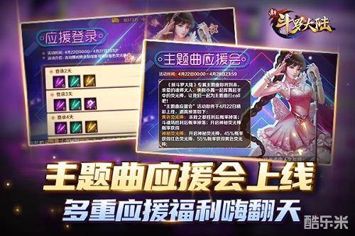 为迎接《新斗罗大陆》手游主题曲上线,4月22日游戏内推出“主题曲应援”系列活动,每日登录游戏,即可免费领取应援登录福利;体验日常游戏内容如杀戮之都、斗魂场等,即可掉落不同颜色的荧光棒应援道具,使用应援道具可兑换游戏资源等。