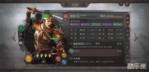 另外关平在游戏中的自带技能和这个武将也不配,奋突是根据普通来叠技能伤害的,另外还有把敌人缴械的几率,但是关平在游戏中输出又不够,只能作为辅助武将来使用,带上奋突并不能发挥最好的效果,何况本来也不强。