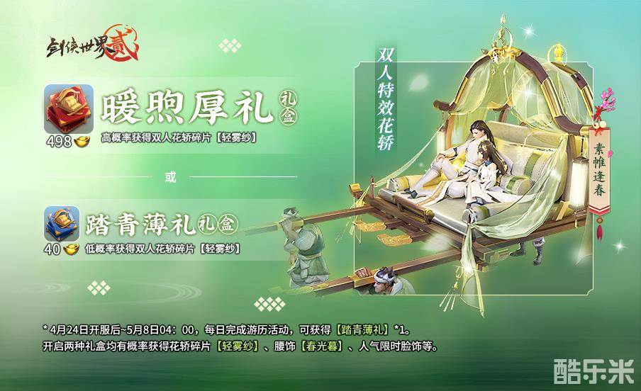 活动期间,奇珍阁-鎏金宝阁限时上架【踏青薄礼】【暖煦厚礼】【宝通·踏青薄礼】【宝通·暖煦厚礼】。开启上述四种礼盒均有机会获得:首款双人特效花轿碎片【轻雾纱】、腰饰【春光暮】、人气限时外观(3天)。
