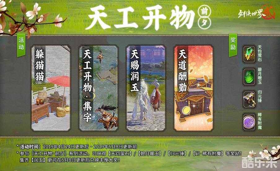 活动期间,少侠参与平定乌蛮活动有概率获得字卡道具,集齐“天”“工”“开”“物”四种字卡即可在活动界面兑换道具【天工礼盒】,开启礼盒将获得归元锤、九转琉璃、一级天均石。少侠可将多余字卡赠送给其他玩家。
