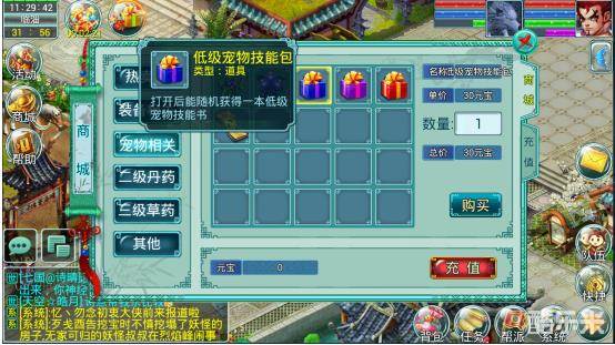 玩家可使用元宝购买低级宠物技能包、中级宠物技能包、高级宠物技能包。