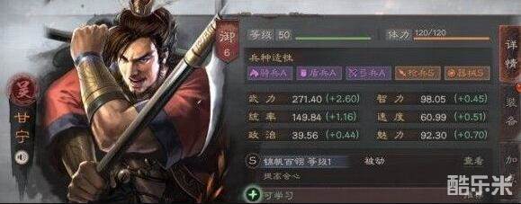 游戏中的甘宁面板数值真的非常高,而且武力值也是名列前茅,超高的物理输出受到了很多玩家们的狭隘,但是智力和速度并不是很高,所以我们要充分发挥他的优点,让他为我们带来更多的优势哦,在战斗中能够提升自己50%暴击的战法真的非常厉害,在平时搭配的时候比较推荐让甘宁提升自己的速度,另外甘宁会比较害怕控制效果,所以带上免控制或是提升韧性的武将也是非常不错的选择哦。