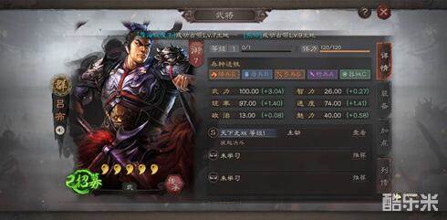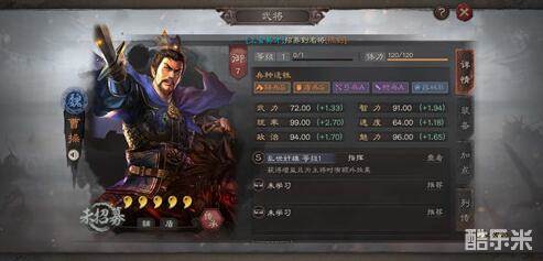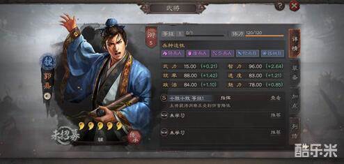 统帅值最高的武将为曹操,基础为99点,成长值为2.7,一个满级的曹操统帅值为231点哦。最后速度最快的武将是郭嘉,他的基础速度是83点,成长值为1.21,满级之后速度为142点。