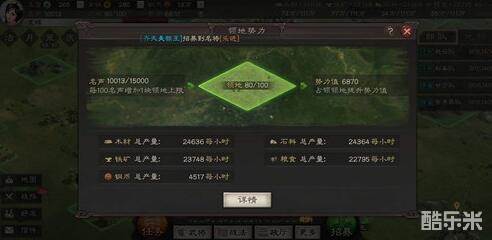 而在游戏中只有五级以上的地才能提供一百点的势力值,我们要是想一天到五千的势力就必须要打过五级地的守军,这个并不是很容易,小伙伴们可以多多尝试一下。