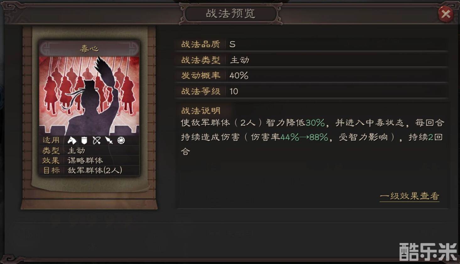 自带的技能可以降低30%智力非常强力,而且自己的智力还非常的高,另外她的主动战法也是比较实用的,玩家们可以尝试能不能加入三势阵来组建出全新的阵容哦。