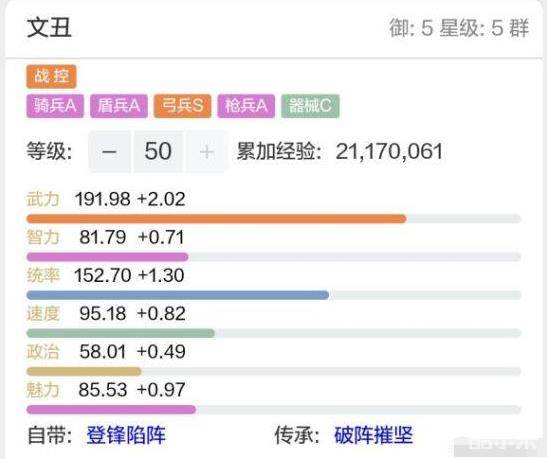 身板:满级武力勉强突破190,只能算二线武将武力。统率突破150,也是中上水平的统率值;智力较低,但是突破80大关,不算zz,起码不会像乌骨大王一样被村夫算死速度中下水平,抢一速有点困难。