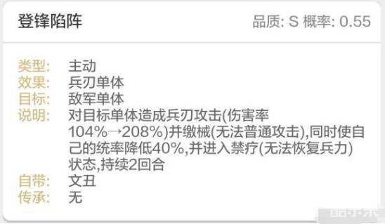 战法:这个战法就相当夸张了,首先这是一个瞬发55%概率战法,触发期望相当高,一局放3-4次是没有问题的;单体208%的伤害,说实话挺一般,但是毕竟发动率这么高了,而且伤害也突破了200%,伤害期望也不低;后面这条就大开眼界了,对那个人缴械,但对自己降低统率和禁疗,持续两回合!这感觉是一个自爆buff,因为单体两回合缴械在控制只能算中上水平,反而是他这个给自己的debuff非常厉害!碰巧的是,降低统率和禁疗刚好是可以很好搭配的负面效果。降低统率扣血就多,还会导致治疗不溢出;再给一个禁疗,那基本上就是一个伤敌1000,自损10000的buff。