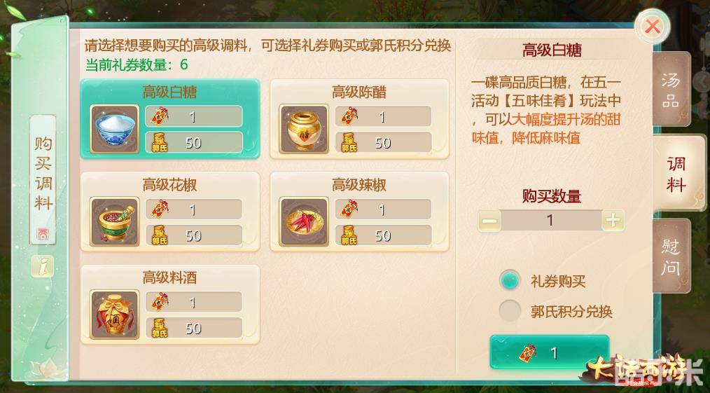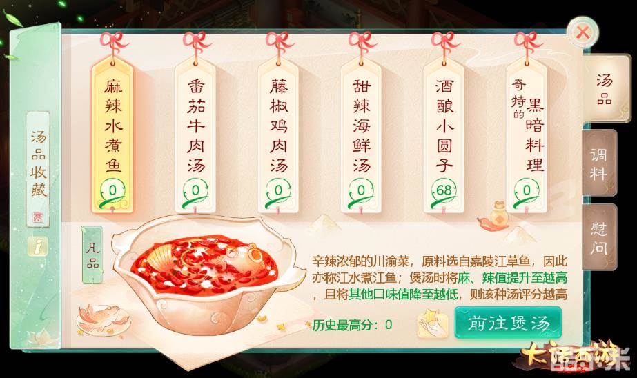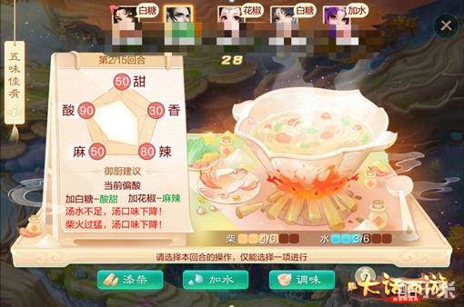 活动开启后,侠士们可以通过活动界面中的“五一盛典-五味佳肴”版块,点击“前往煲汤”,前往东海渔村NPC汤老板处领取任务。所谓五味佳肴,这“五味”自然是汤的灵魂——五种调料分别是:白糖(甜)、陈醋(酸)、花椒(麻)、辣椒(辣)、料酒(香),每种调料还分为普通和高级两种品质,侠士们在煲汤的时候需要分次加入调料,通过自己和队友的精心调理,才能调配出整锅汤的最佳口味。
