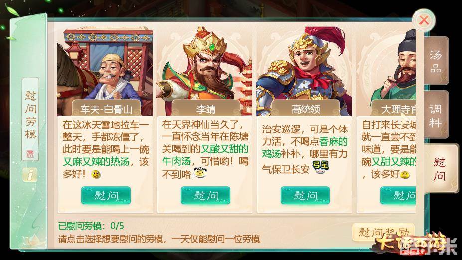 每日第一次煲汤可以获得经验和物品奖励,煲汤的评分也会被记录进“汤品收藏”,大家可以多多尝试自己的手艺,煲出更高评分的汤刷新自己记录。在活动期间,大家可以把煲好的汤送给五名大话劳模(NPC)其中之一,对他们进行慰问,需要注意的是,每个劳模都有自己偏好的口味,根据他的口味送出高评分的汤,就能获得更多奖励!