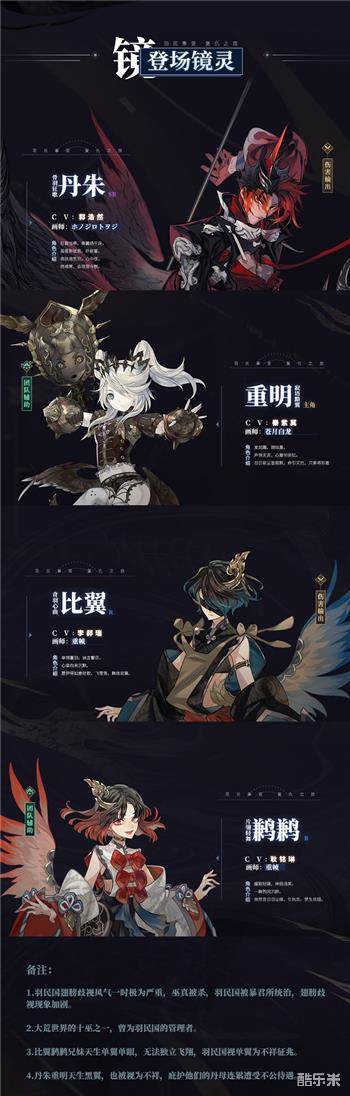 生为天谴之兆,骨羽嶙峋,见证复仇之誓言,羽民之国的故事等各位龙子大人探索。来自羽民国的角色们都背负着痛苦的过去与沉重的宿命,发生在羽民国的纷乱,导致族群内的不祥之人遭到驱逐,天生拥有象征不祥的黑羽而备受冷落的少女重明(CV:秦紫翼),备受欺凌的比翼(CV:李赫瑞)与鹣鹣(CV:耿铭琳),还有原本出生富贵,却因饱受族人偏见的丹朱(CV:郭浩然)。羞耻与不公的境遇,象征着不祥的人们被迫离开故乡浪迹大荒,也在他们心中埋下了复仇的火种……