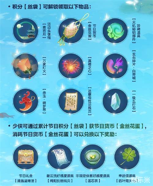 少侠可以通过累计节日积分【丝袋】获得节日货币【金丝花蛋】,消耗节日货币【金丝花蛋】可以兑换谢云流好感度道具【纯阳别册残页】、非限定侠客好感度道具【莲芯茶】、有几率开出【未锻打飞仙玄晶】的礼盒【流晶溢璀匣】、幸运值道具【四叶南天七】等珍稀物品,本奖池兑换截止时间为5月18日维护前。