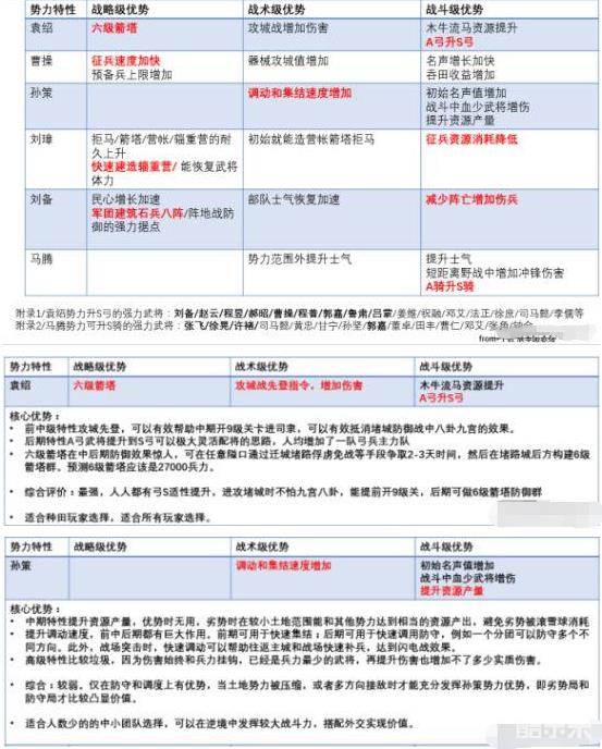 刘备曹操:比较均衡,战斗,续航,攻城,防守上都有很好的特性。不过曹操势力特性全在隐藏数值里,游戏体验和s3一样,毫无新鲜感。
