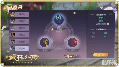 修为是少侠的专属属性,在PVP活动中生效,如武状元、荒林竞技场、毒海鏖战等。少侠对神兵的培育将同时提升战力与修为。新赛季主题属性为格挡&会心,神兵灭世斧在增强修为的同时,也将为少侠带来150点格挡与会心的增益。