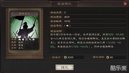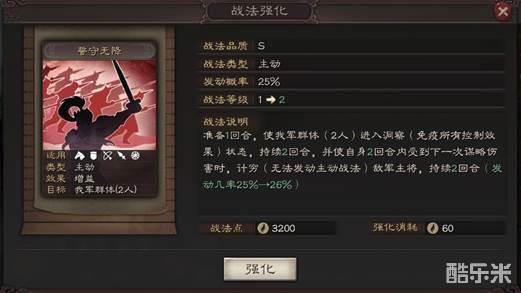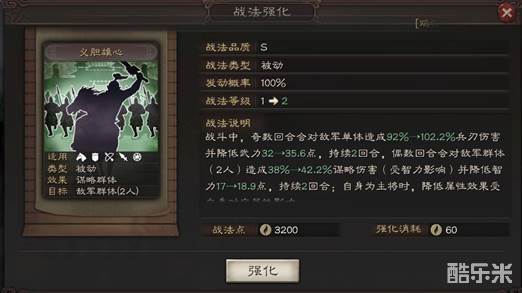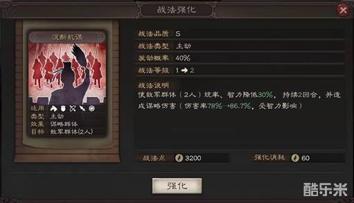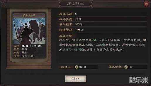 战法特性:战斗中,为己方主将分担伤害的同时,提高主将奇谋几率(触发时谋略伤害提高100%)以及奇谋伤害。