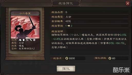 战法特性:移除敌军群体(1-2人)的增益状态,同时提高我军全体1回合主动战法发动几率,并使我军全体下一次发动主动战法后,会对敌军单体造成谋略攻击。