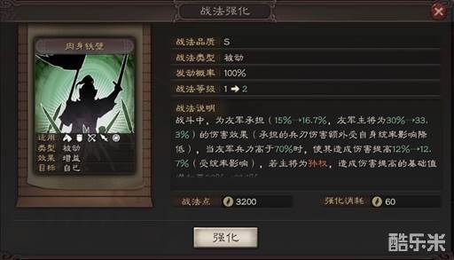 战法特性:战斗中,为友军承担部分伤害,且当友军兵力高于70%时,提高友军输出伤害。若主将为孙权时,输出伤害的增益效果更高。