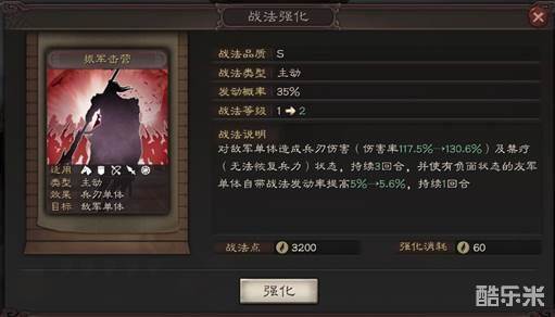战法特性:对敌军单体造成兵刃伤害及禁疗效果,持续3回合,并使有负面状态的友军自带的单体战法发动率提高,持续1回合。