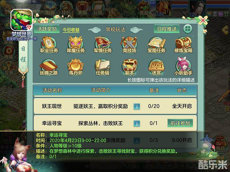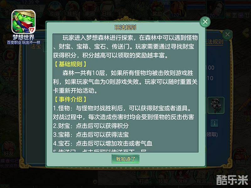 少侠们需要进入梦想森林进行探索,在森林中将会遇到怪物、财宝、宝箱、宝石、传送门。玩家需要通过寻找财宝获得积分,积分越高可以领取的奖励越丰厚。