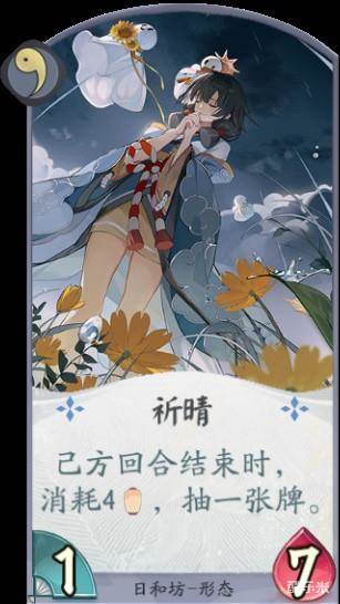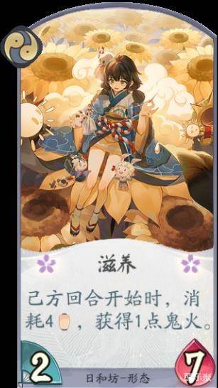 “祈晴”这张形态卡,开启了日和坊祈愿晴日的状态,可以通过消耗日和坊的能量来过牌,在牌局初期确保了式神的战斗力;二勾玉阶段的“滋养”形态则是源源不断的鬼火供给,更强的行动能力也是立于不败之地的不二法门。