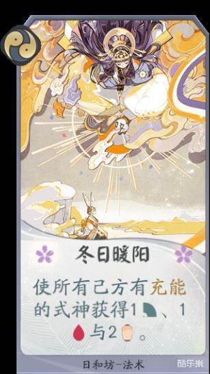 作为所有充能型式神的“加油站”,日和坊“冬日暖阳”绝对是日和坊与其他充能型式神搭配时,不可缺少的卡牌之一。一点攻击力、一点生命值与两点能量,看似不多却能在关键时刻发挥强大效果,不妨多多尝试一下。