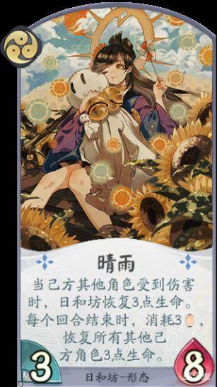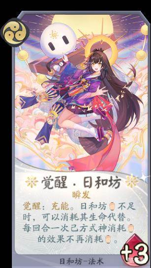 当日和坊成长到三勾玉阶段,她的觉醒状态更是能用生命交换能量值,让己方其他式神的法术也不再消耗能量值,分分钟爆炸的节奏。而“晴雨”则开启了每回合群体治疗3点生命值的状态,是让敌方非常头疼的一张卡牌。由于日和坊优秀的生命值成长,想要击杀她还并非易事。