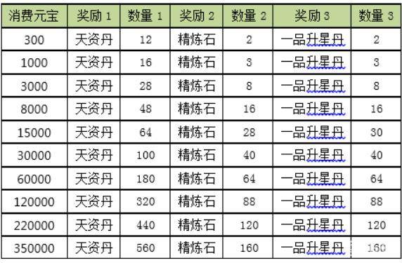 3. 本次消费最高档位350000非绑定元宝,所有奖励向上兼容.