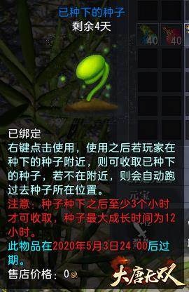 有句口号说的好,要致富呀先种树。所以在这4月29日至5月3日的五一劳动节小黄金周里,爱劳动的玩家们可以向主城里的“节日使者”领取3枚神奇的“劳动节种子”以及“种子探测器”道具。其中“劳动节种子”可以种植在蜀南竹海、野象谷、鸣沙山、寒晶池、塔林、侠隐岛、青城山、黑风寨、白屏寨、梨花谷等肥沃的土地中,并且随着种子生根发芽成长,所结出的果实奖励也会越来越好。