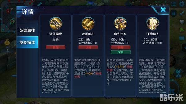 强化霰弹:刘备的火铳发射霰弹。子弹命中敌人会给刘备叠加双抗持续数秒,可以叠加数层。霰弹只有中间的数颗可以暴击和触发装备效果,敌人会受到额外的伤害。由于被动的效果,所以刘备需要靠近敌人时在输出,刘备越靠近敌人输出越高。