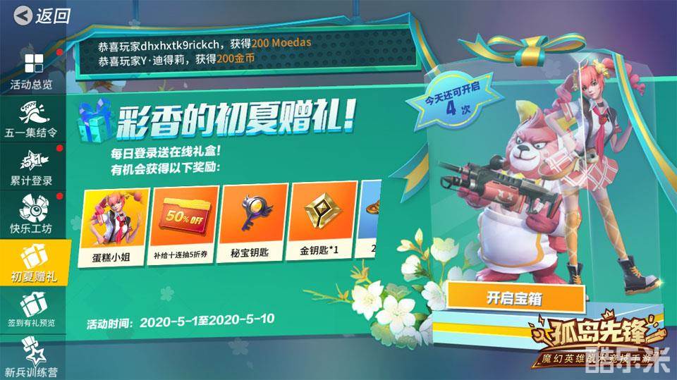 温暖初夏,花香四溢,爱美的少女彩香也在《孤岛先锋》的畅快战斗中放下心头重担,开始体验与玩家分享惊喜的快乐。在5月1日至5月10日期间,玩家每天首次登陆游戏时都可以获得1次开启“彩香赠礼”的机会,而累积在线时长还可以获得更多开箱机会。开启“彩香赠礼”礼盒将有机会获得钻石、金币、英雄能量、补给十连5折券、金钥匙等道具,更有机会获得极恶双子的传说皮肤“蛋糕小姐”。