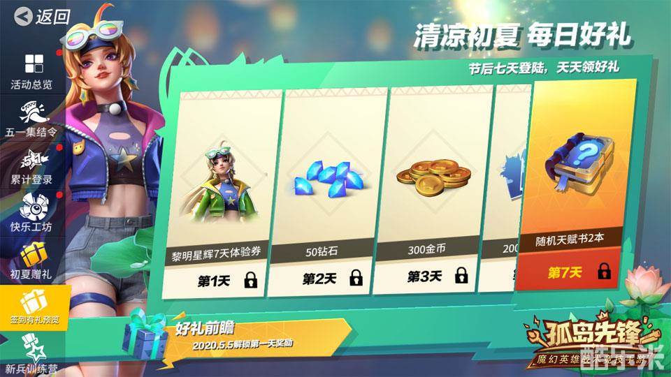 《孤岛先锋》的初夏惊喜还不止如此,在5月5日至5月11日期间,玩家每天登录即可领取钻石、金币、英雄能量、随机天赋书等奖励,更有外观“黎明星辉”7天体验券,免费体验劲爽夏日风情。