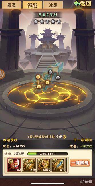 少年通过消耗红、暗金、彩金装备碎片,可使琉金装备获得魂值,达到足够的魂值即可提升等级。炼化等级将折换成经验,继承入“铸魂”中。轻松灵化,加强战力!