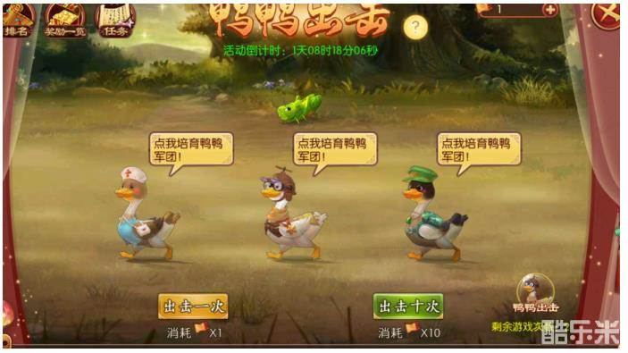 1、活动期间,小主们可点击游戏屏幕右下角的“限时活动”按钮,点击“鸭鸭出击”即可查看并参与活动。活动结束后进军旗清零,鸭饲料在背包内可售卖。