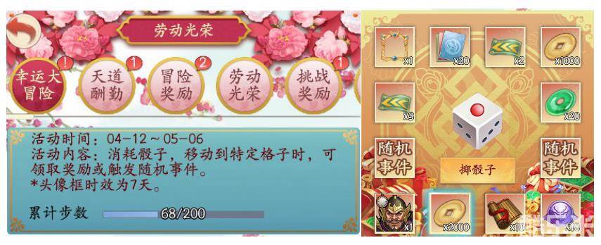 劳动节期间消耗骰子,移动到特定格子时,可领取奖励或触发随机事件。五一头像框、金币宝玉、天书名望、限定潘凤一掷就送!