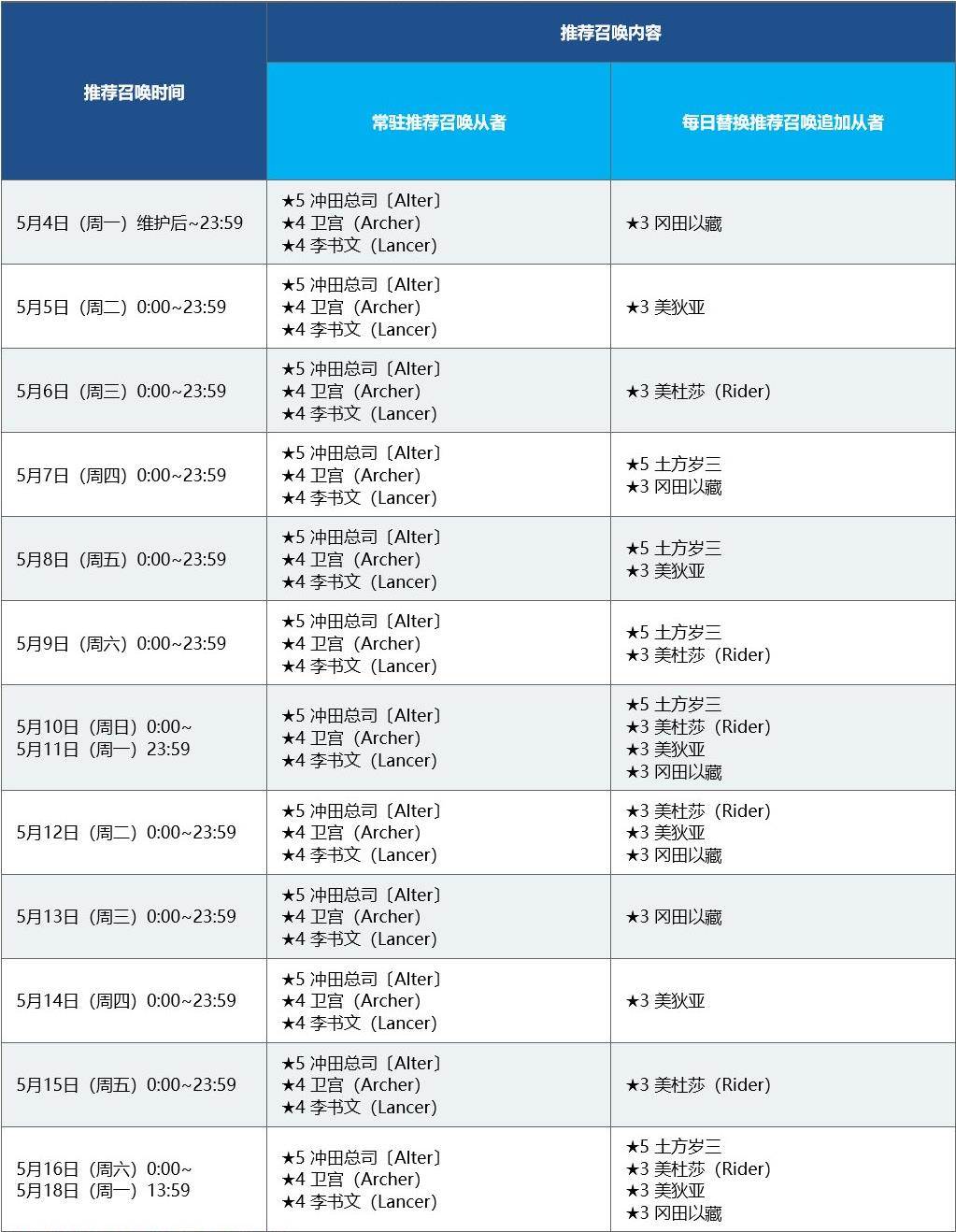 「★5(SSR)冲田总司〔Alter〕」、「★4(SR)卫宫(Archer)」、「★4(SR)李书文(Lancer)」将一直被推荐召唤。