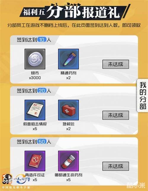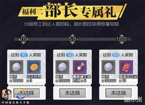 身为分部的部长,你不仅获得“邀请好友礼”、“新人报道礼”和“分部报道礼”等活动的福利,还能在分部员工达到10、50、100人时,额外即可解锁“部长专属礼”三重福利!