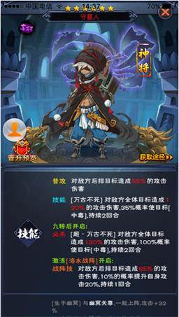战阵、天赋、属性都是偏向防御的,可以说是血牛了,再加上两个免伤天赋和自身的提升抗爆,在前期也是一个很强的肉盾了,加10的被攻击百分之30概率更是一个坑人利器,比吞天邪帝的减怒好太多了,经过实际测试这个是相当管用的。