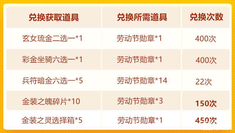 「劳动节勋章」可兑换玄女琉金二选一、彩金坐骑六选一、兵符暗金六选一等资源: