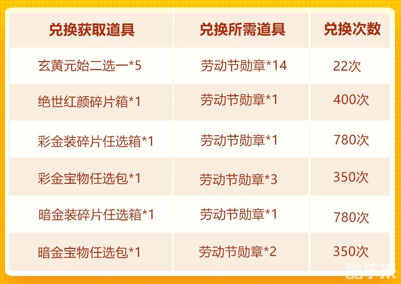 「劳动节勋章」可兑换玄黄元始二选一、绝世红颜碎片箱、彩金装碎片任选箱、彩金宝物任选包等资源: