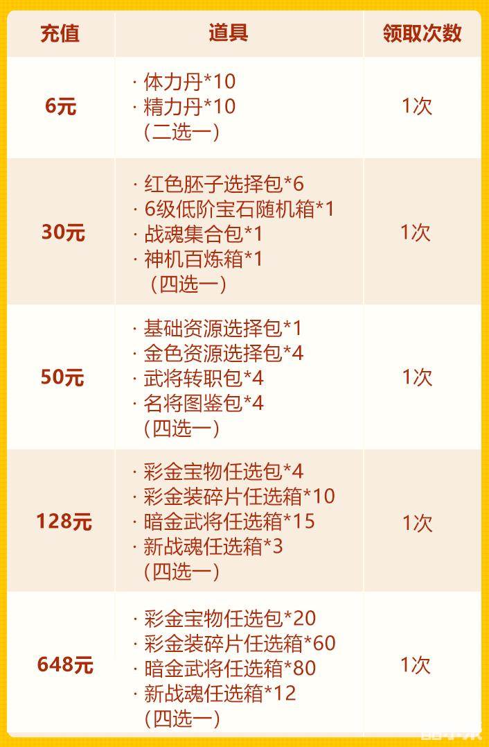 少年们单笔充值指定金额,即可得到彩金宝物任选包、彩金装碎片任选箱、暗金武将任选箱、新战魂任选箱等珍稀道具!并且可以和欢庆佳节中的充值活动叠加,少年们千万不要错过哟~